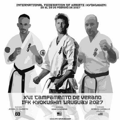 XVI Campamento de verano 2027Se confirma el campamento de verano 2027. La decimosexta edición del campamento de verano se realizará del 25 al 28 de febrero de 2027. El campamento internacional contará con la participación de grandes referentes de la IFK de nuestro continente. De Estados Unidos Shihan Sean Schenker, de Brazil Shihan Jeovaldo Barreto y de Uruguay Shihan Germán Carballo. Próximamente se estará enviando la agenda del evento y la confirmación de la locación. En el 2027 sé parte! Osu