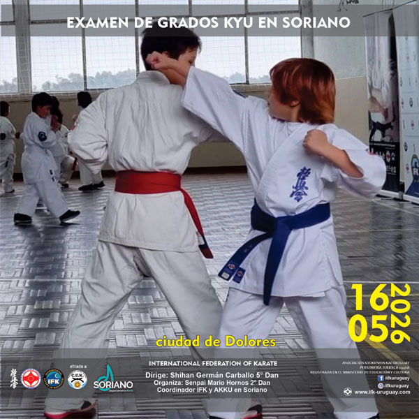 Examen para pasaje de grados en Dolores I Soriano.El próximo 30 de Enero se realizará en el estadio cerrado Ing. Magnone de la ciudad de Dolores (Soriano) el primer periodo de pasaje de grados del año para dicho departamento. La mesa de examen contará con Sensei Germán Carballo (Presidente AKKU), Senpai Noelia Fabre (Tesorera AKKU), Senpai Santiago Mosco (VP AKK) y Senpai Mario Hornos (Coordinador de la AKKU para Soriano). El evento está apoyado por la secretaría de Deportes de la Intendencia de Soriano y la alcaldía de la ciudad de Dolores. Éxitos a todos los postulantes. OSU! Post:
